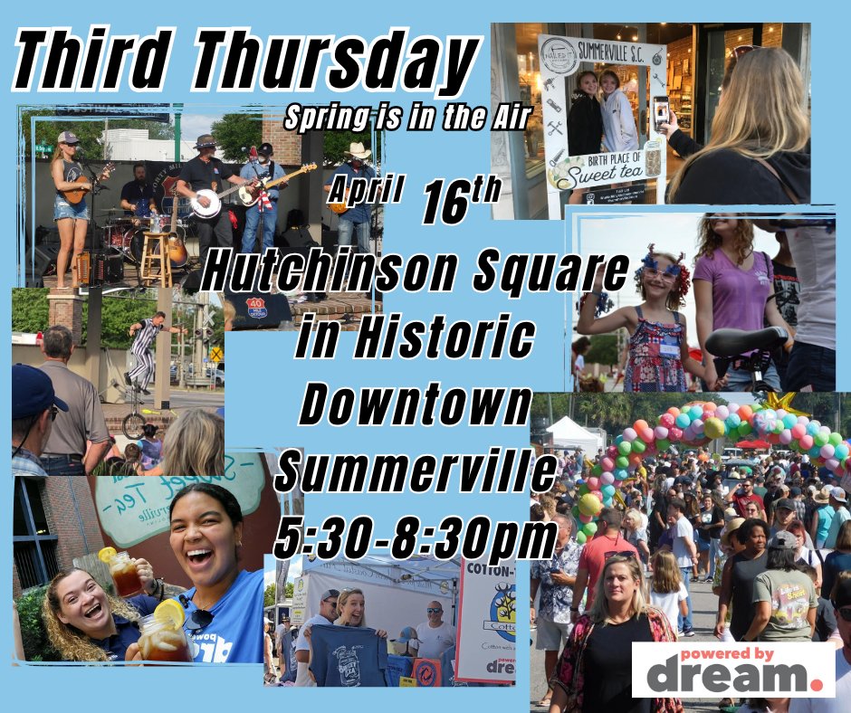 Come enjoy an evening in Downtown Summerville with some live music, vendors, extended hours at our fellow local small businesses for shopping and get that hometown feeling you can only get in Downtown Summerville! April 16th in Hutchinson Square!