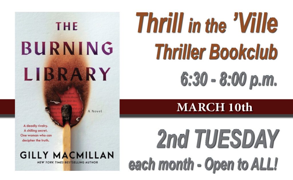 Come join the Thrill in the ‘Ville thriller book club discussion – wine and apps are free, and as always, our clubs are free and open to all, PLUS the book club picks are offered at the 10% off book club discount.
