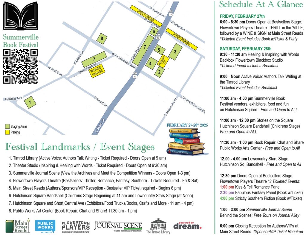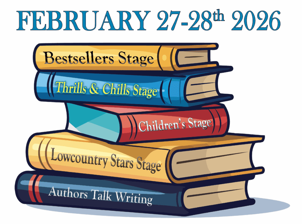 Summerville Book Festival author stages include our Bestsellers Stage at the Flowertown Theatre (paid programming with books signed by select authors Friday & Saturday and 10% discounts on ALL festival books); a free Children’s Stage (Saturday am) and free Lowcountry Stars Stage (Saturday afternoon) on Hutchinson Square; the Authors Voice event at the Timrod Library; and a Healing w/Words Signing & Salon breakfast!
